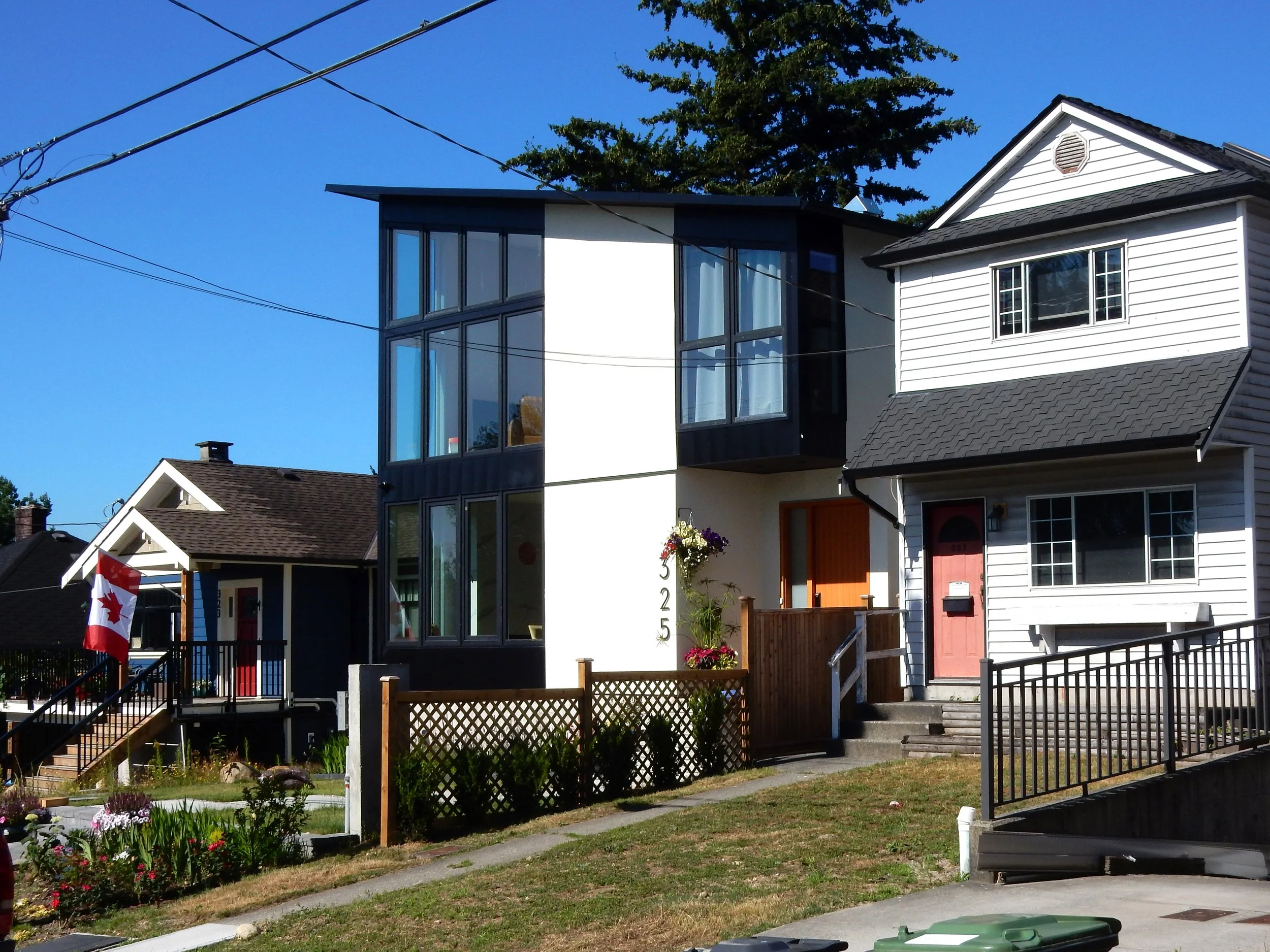 This Bauhaus inspired home, with monolithic white surfaces against dark voids of glass transparency, was designed for a family with two aspiring daughters excelling in their school studies, piano and swimming training. Advanced analysis of zoning and coordination with city planners allowed a 16’ high cathedral ceiling and window wall with sweeping vistas of the Fraser River and Mt. Baker in Washington State. The roof assembly features a dropped ceiling to minimize penetrations through the air barrier with a perimeter light alcove that also conceals an automated blind system. The overhangs have a slim profile and are an extension of the ventilation sleepers. The daughters’ bedrooms are each built with deep bay window seating and ceiling high windows capturing westerly sunlight.