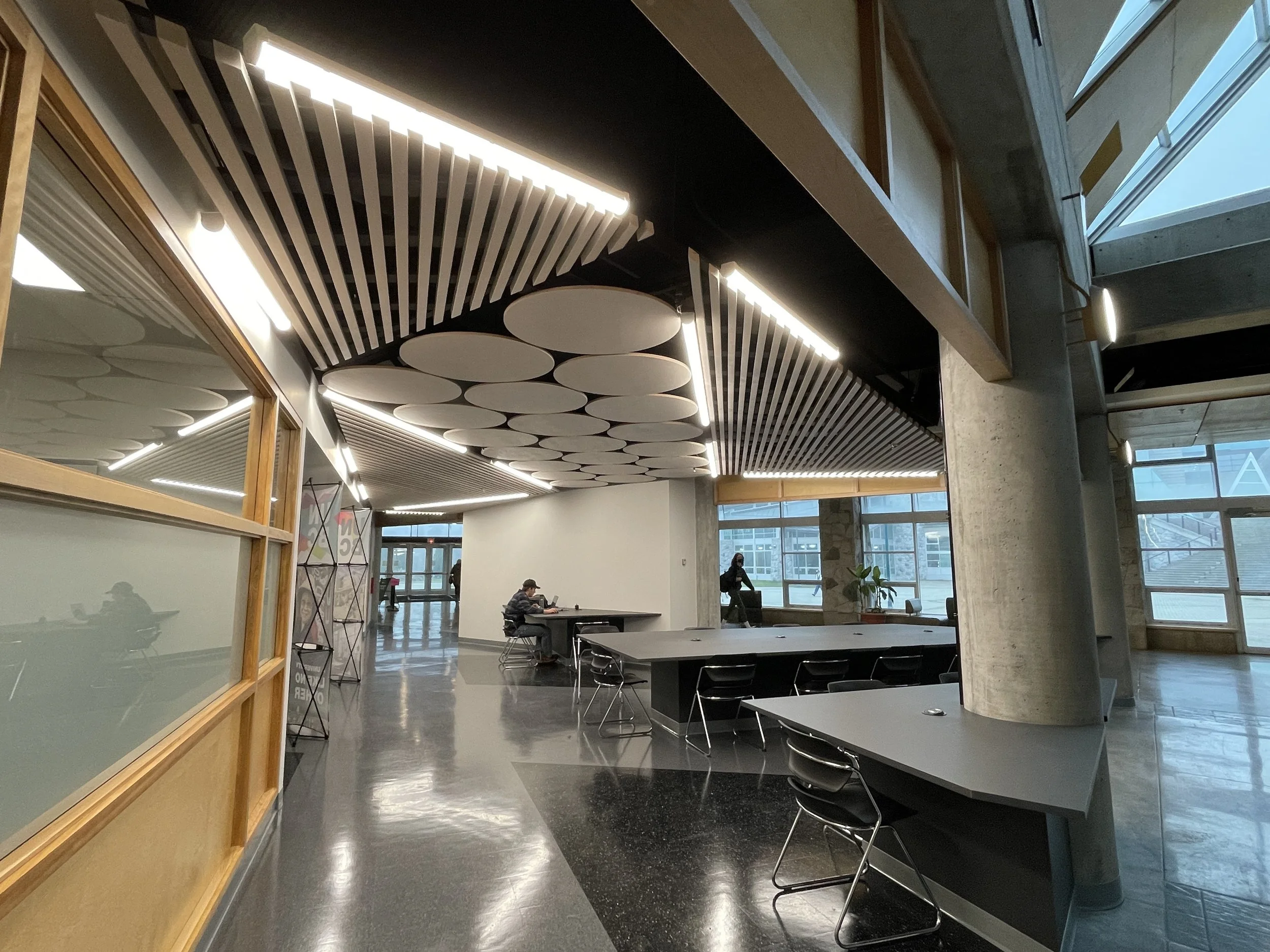 The new Learning Commons at the ground floor of Geoffrey R. Weller Library provides students with library services, research and tutoring assistance, event space and a 24 hour study, group work and social gathering space equipped with enough laptop power receptacles within reach of every seat. A variety of semi-private spaces such as pod seating, long tables and high tops strategically flank an “interior street” provide different scenarios for human visibility and serendipitous cross-pollination. By removing existing storefront glazing that formerly enclosed the library space, open access and visual welcome to the Learning Commons has resulted in the establishment of a busy social hub for students at any hour of day or night. Curvilinear millwork seating at the entrance concourse serves as a gathering place for indigenous elders and canvas for a First Nation’s art installation.